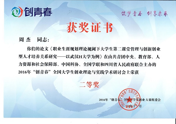 公司辅导员周杰在2016年“创青春”全国老员工创业理论与实践学术研讨会上获奖